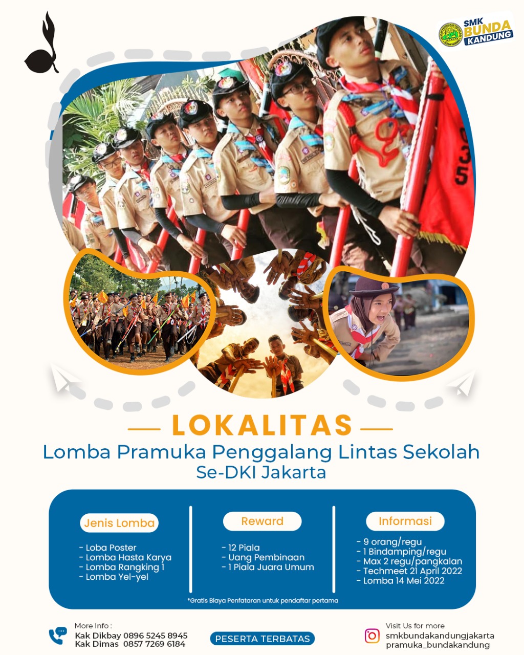 - Lomba akan dilaksanakan secara langsung atau luring di SMK Bunda Kandung pada tanggal 14 Mei 2022. Lomba Pramuka Lintas Sekolah (LOKALITAS) angkatan 1 tingkat pramuka penggalang SMP/MI Se-Provinsi DKI Jakarta terdiri dari 4 bidang perlombaan: